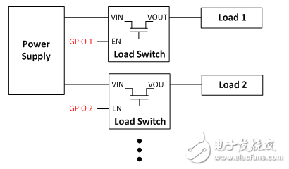 在电源和电容负载之间放置一个负载开关能够极大地降低接通/启用负载时的涌入电流。很多处理器和FPGA具有非常明确的电源排序要求,以及一个特定的电源轨接通顺序。负载开关使满足电源排序要求变得更加简单,从而实现针对每个电源轨的负载点控制。那么,为每个电源轨供电就简单到只需将正确的GPIO信号发送给正确的负载开关。图2显示了这个概念。