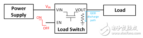 负载开关对于系统断电同样有效。负载开关的下降时间由输出负载对其电容的放电速度决定。为了加快这个放电过程,并且确保一个0V状态,某些负载开关具有一个快速输出放电 (QOD) 特性,如图4所示,这个特性通过一个内部电阻将输出放电至接地电平。