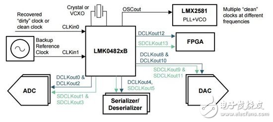 LMK04821系列器件为该话题提供了很好的范例研究素材,因为它们是高性能的双环路抖动清除器,可在具有器件和SYSREF时钟的子类1时钟方案里驱动多达七个JESD204B转换器或逻辑器件。图1是典型JESD204B系统(以LMK04821系列器件作为时钟解决方案)的高级方框图。