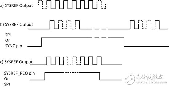 图2:LMK0482x的SYSREF模式是:a)连续性SYSREF;b)脉冲式SYSREF(一次性或有间隙的周期性模式);c)SYSREF请求(有间隙的周期性模式)