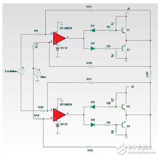 在过去,常要求设计人员用分立组件来满足这种需要。要用分立组件设计一种简单的大电流放大器,您需要放大器、双极结型晶体管(BJT)和二极管。图1所示就是这样的一个范例,通常用于电机驱动器应用。该实施方案可驱动解析器(用来测量电机轴旋转角度)的励磁线圈。您可在许多汽车和工业应用中找到放大器设计(如驱动电感性负载)。这种典型的解决方案会在电路板空间和输出晶体管偏置方面给设计人员带来挑战。