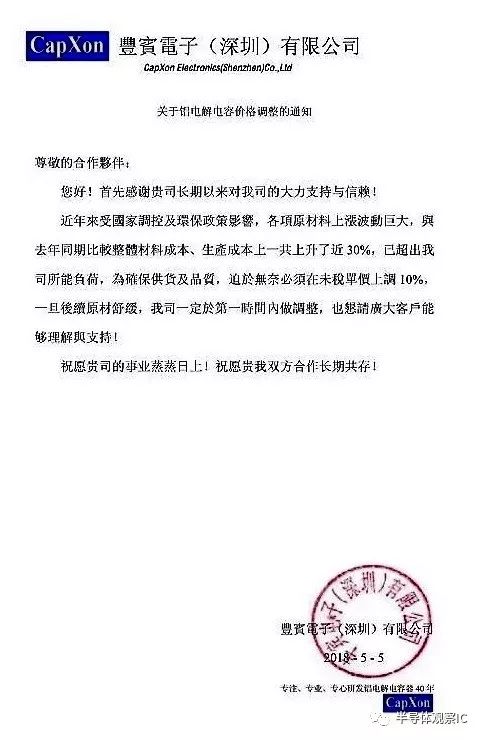 后记: 在采访写作完成之后,记者收到最新资讯,即台资(香港上市)铝电解电容丰宾电子的涨价10%的通知: