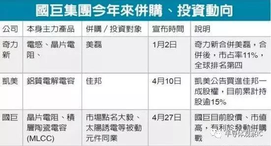 在今年年初,国巨旗下电感厂奇力新就以换股方式并购同业美磊;凯美也在本月上旬公告持有保护元件和天线厂佳邦一成股权;随着国巨今日停牌,预期宣告集团今年确实是大举扩张的一年。