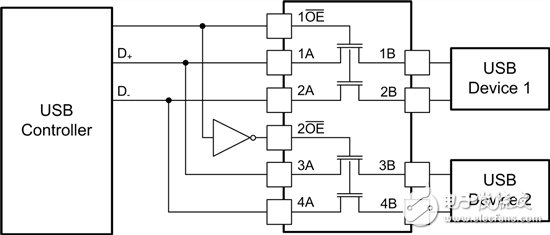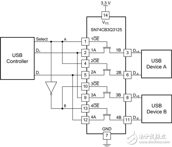 图4:将2个USB器件复用至一个控制器时的SN74CB3Q3125接线