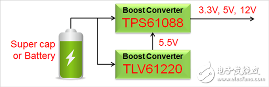图1:通过用小功率TLV61220为大功率TPS61088供电,PMP9772参考设计可完全耗尽超级电容器或电池中的电能
