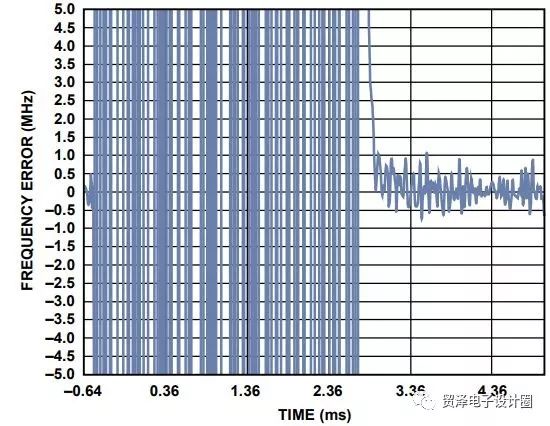 按照上述步骤校准完成后,PLL 的反馈操作使 VCO 锁定于正确的频率。锁定速度取决于非线性周跳行为。PLL总锁定时间包括两个部分:VCO频段校准时间和PLL周跳时间。VCO频段校准时间仅取决于PFD频率;PFD频率越高,锁定时间越短。PLL 周跳时间由所实现的环路带宽决定。当环路带宽比 PFD 频率窄时,小数 N 分频/整 数N 分频频率合成器就会发生周跳。 PFD 输入端的相位误差积累过快,PLL 来不及校正,电荷泵暂时沿错误方向吸入电荷,使锁定时间急剧缩短。如果 PFD 频率与环路带宽的比值提高,周跳也会增加;对于给定 PFD 周期,提高环路带宽会缩短周跳时间。
