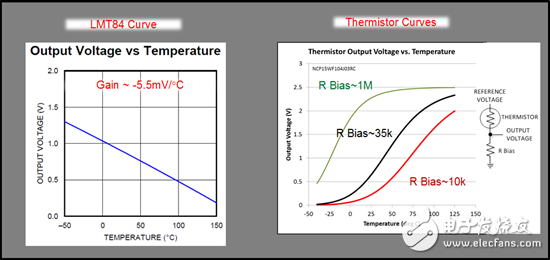 另外一个优势就是IC温度传感器是高度线性的,这就最大限度地减少了对软件补偿的需要。图1是一个模拟IC温度传感器与一个热敏电阻之间的线性比较。