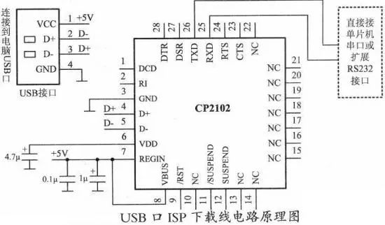 随着计算机的发展,现在的笔记本电脑甚至一些台式计算机上面均不再配置RS232接口,取而代之的是USB接口,但在一些制作或设备中RS232接口仍很常见,因此有必要设计一个USB转串口电路。目前用于USB转串口的专用芯片很多,综合成本、性能和电路简单程度,笔者介绍由美国SILICon公司生产的高集成度USB转UART芯片CP2102。该芯片符合USB规范2.0,全速12Mbps,片内集成USB收发器,无须外部电阻,内部集成时钟,无需外部振荡器,因此其最重要的特点是单片集成转换器所需的全部电路,可以在不使用任何分离元件情况下独立实现接口转换功能。下图即为利用CP2102芯片设计的USB口ISP下载线电路原理图。
