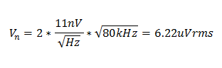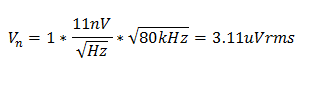 OPA316有一个11nV/√Hz的宽带输入电压噪声频谱密度,测量带宽的额定值为80kHz。对于非反向放大器 (G = +1),RMS噪声电压大约为: