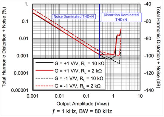 针对低噪声的电路设计具有噪声不断增加的不良反应。具有低值反馈电阻器的非反向运算放大器可以提供特别低的噪声,但是额外的负载和共模电压会增加高频失真。了解噪声或失真是否会限制系统性能在工程设计完整的上十分重要。了解一些运算以及能够看懂数据表THD+N图,很快就可以清楚到底是噪声还是失真出现了问题。
