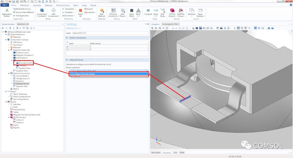 借助 COMSOL Multiphysics,您不仅可以毫不费力地建立电路模型(在 COMSOL 软件中创建,或者通过导入 SPICE 网表创建),随后还可以将这些电路模型与有限元模型关联起来。因为 COMSOL Multiphysics 可以识别出哪些部件可以耦合在一起———并在便捷的下拉框中列出了这些选项,所以您可以利用电感器全三维模型和电路模型之间的内置连接特征,轻松地将电感器与驱动电路连接起来。