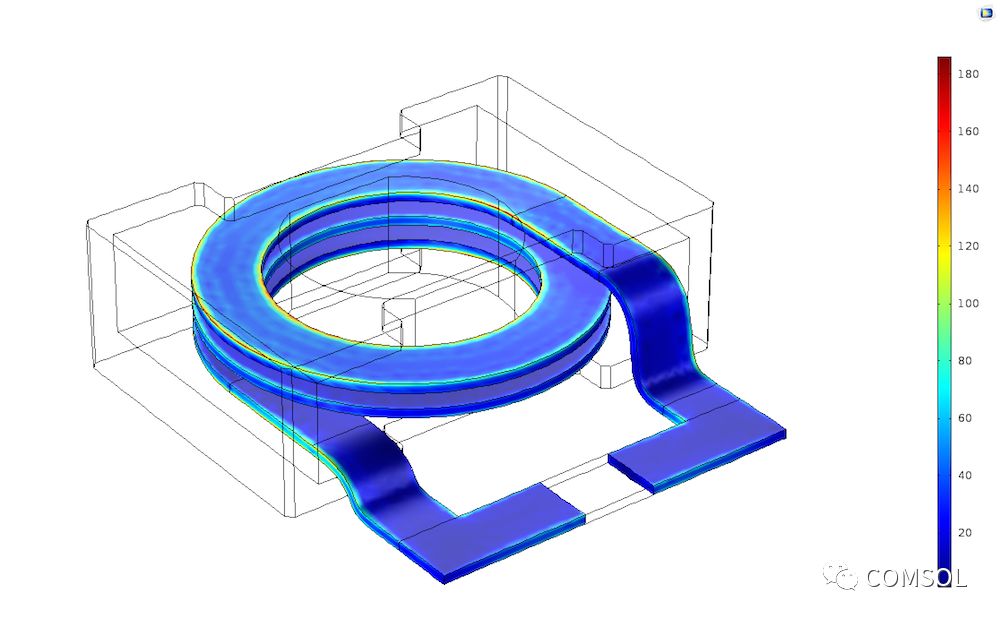 众所周知,由于集肤效应,在高频下(您的电感器可能在此频率下工作)电感器内的电流会限制在导体表面附近。在本文的应用示例中,集肤效应已包含在 COMSOL Multiphysics 的阻抗边界条件中。解析薄层中的电流是一个计算量非常大的过程,将其简化为边界条件能节省时间,从而加速对设计的研究。