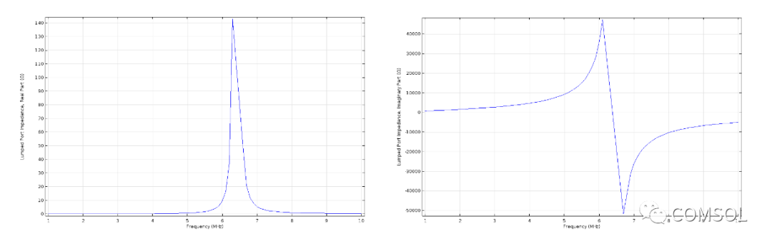 阻抗 Z 的实部(左图)和虚部(右图)显示了电感和电容行为之间的谐振与切换。