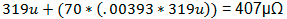 如果初始容限为10%,那么图1所示180nH电感器的DCR可能低至261mΩ或高达319mΩ。雪上加霜的是,电感器会发热,铜线绕组的温度系数为3930PPM/ºC或0.393%/ºC。如果应用的温度上升至比环境温度高35ºC,电感器本身发热使温度再上升35ºC,那么标称DCR就可能升至: