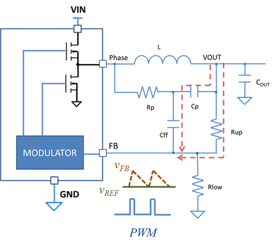 对DCAPx调节器而言,确定PWM调制增益的是由DCR注入网络和输出电容器等效串联电阻(ESR)在FB引脚处形成的三角波形的下降斜率。沿扰动注入线缆的寄生电感和电阻以及耦合至导线的噪声将篡改FB引脚处的三角波形,从而使PWM调制增益不同于无测试设置的调节器的增益。