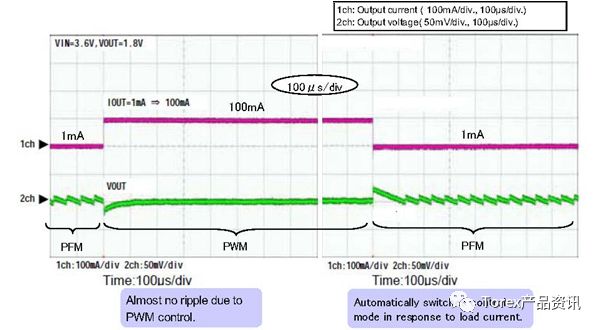 图5 PFM控制和PWM控制自动转换波形(负载电流:1mA⇔100mA)