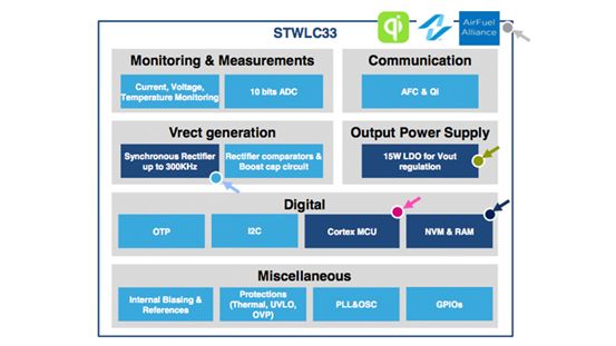 在接收端,ST的方案是基于15W接收控制器芯片STWLC33。这款电磁感应式无线充电接收器可以同时支持Qi 1.2和AirFuel感应式无线充电两种协议,而且可以根据需要将自己的“角色”由接收器切换为发射器模式,为其他设备供电。该芯片还集成了高效率同步整流器、低压差线性稳压器以及输入电压调节环路,可实现的系统总效率高达80%。