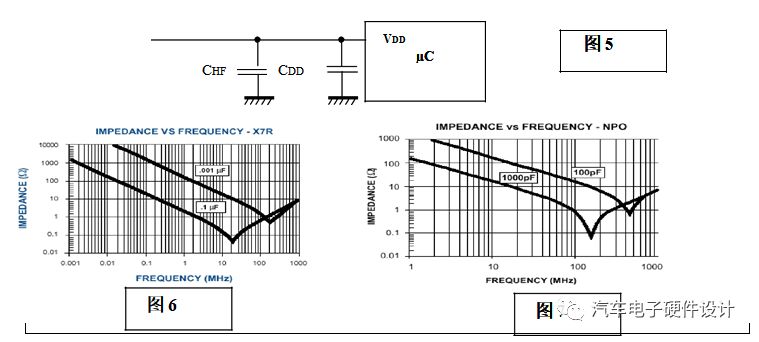 从EMC的角度来看,这种过滤建议对于低频扰动是有效的。这种电容的内部电感(大约5nH)在10MHz周围产生了一个平行的共振频率。为了防止在这个频率范围之外的干扰,如静电干扰,推荐使用第二个低值的电容器。