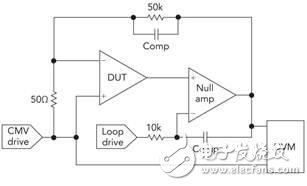 图 3. 该双放大器环路可帮助您测量运算放大器的 CMRR。