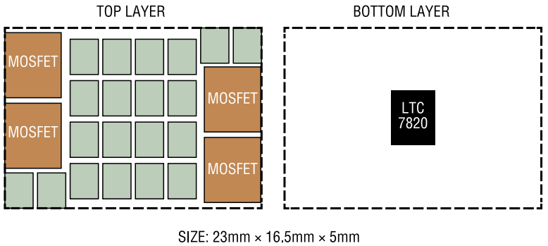 如图 2 所示,该解决方案的大致尺寸为 23mm x 16.5mm x 5mm,而功率密度高达 1500W/in3。