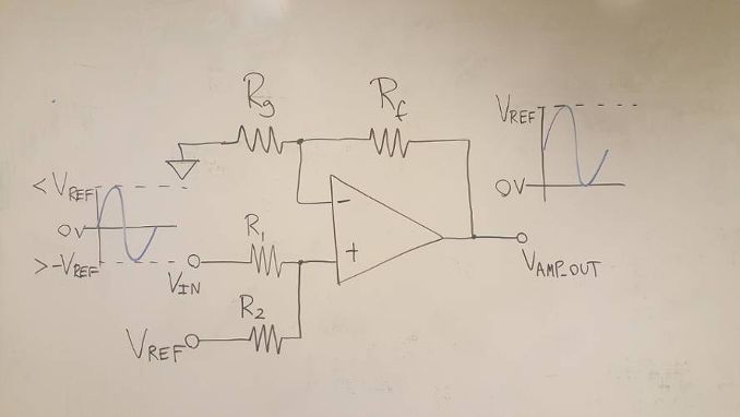 与普通同相配置类似,Rf和Rg之比决定从IN+到AMP_OUT的增益,但此比值现在也依赖于vIN的输入幅度。注意vIN为双极性,但同相节点上的电压为单极性。这意味着,对应于vIN的最小值,IN+上的电压必须为0 V: