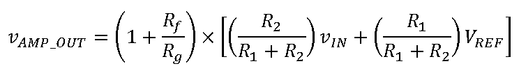 Rf和Rg可利用该配置的传递函数以及vIN为0 V时ADC驱动器输出(vAMP_OUT)等于VREF/2的条件来确定。求解Rf和Rg的方程可得:
