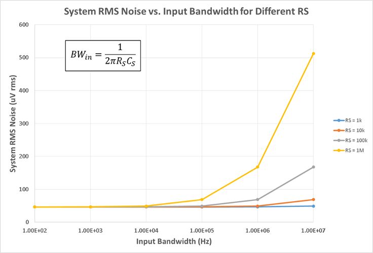 系统总噪声为ADAQ798x中各噪声源的和方根,包括RS的噪声、ADC驱动器的输入电压噪声和ADC的有效值噪声。下图显示了多个RS值对应的系统噪声与输入带宽的关系。