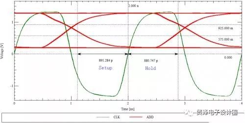 由上图3.我们可以知道,该地址信号的建立时间大约为891ps,保持时间为881ps。这是在时钟与地址信号完全等长情况下的波形。如果地址与时钟不等长,信号又是什么样的呢?仿真中,我们让地址线比时钟线慢200ps,得到的与眼图如下: