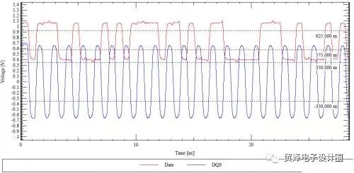 由上图可知,在地址信号比时钟信号长的情况下,保持时间为684ps,建立越为1.1ns。可见,相对于地址线与时钟线等长来说,地址线比时钟线长会使地址信号的建立时间更短。同理,如果时钟线比地址线长,则建立时间会变长,而保持时间会变短。那么双倍速率的数据信号又是怎样的?下面通过具体的仿真实例来看一下。