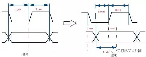 上图中,T_vb与T_va表示的是主控芯片在输出数据时时钟与数据之间的时序参数。在理想情况下,时钟边沿和数据电平的中心是对齐的,由于时钟和数据传输通道不等长,使得时钟边沿没有和数据脉冲的中间位置对其,使得建立时间的裕量变小。在理解了这些基础问题之后,我们需要做的就是将这些时间参数转化为线长。