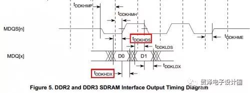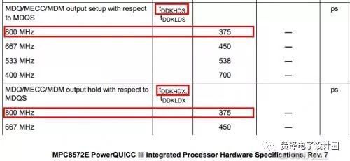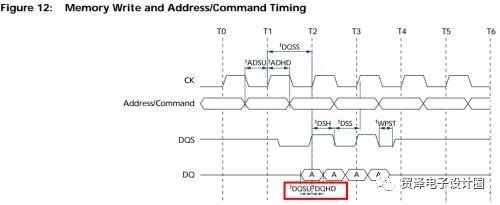 下面我们通过具体实例来看看时序的计算,下图是Freescale MPC8572 DDR主控芯片手册,这张图片定义了从芯片出来的时候,DQS与DQ之间的相位关系。