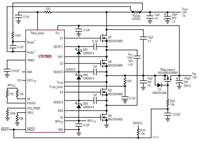 图 1:一款采用 LTC7820 的高效率、高功率密度 12V VIN 至 24V/7A 倍压器