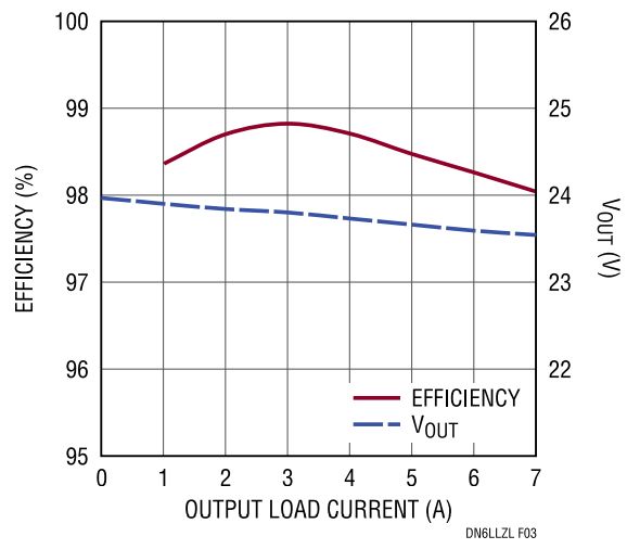 图 3:12V VIN 至 24V/7A 倍压器在 500kHz fSW 时的效率和负载调整率