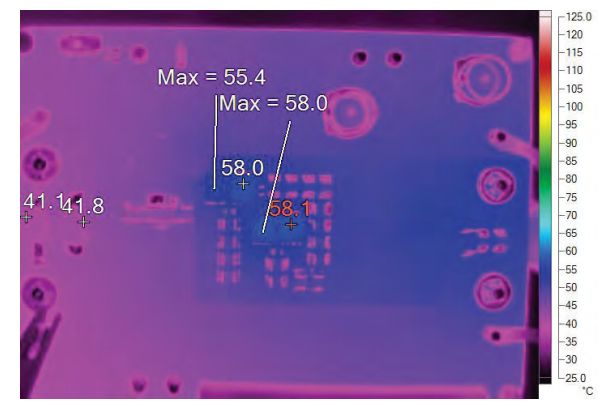 在 4 个开关之间实现功耗平衡,传播热耗散,并使智能布局中减少发热的工作得以简化。图 4 中的温度记录仪显示,在 23°C 的环境温度和自由空气流动的情况下,热点的温升仅为 35°C。