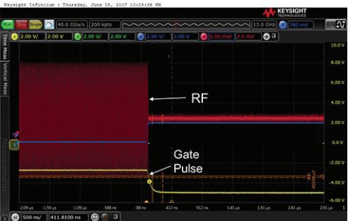 实测开启时间如图4所示。时间标度为每格500 ns,RF信号的上升时间小于200 ns。对于测量从栅极脉冲开始到RF脉冲上升沿结束的时间的系统,可以看到开启时间约为300 ns,这说明系统分配1 μs用于发射到接收转换会有相当可观的裕量。