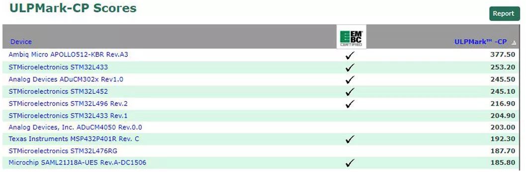 图2. ULPMark-CP结果前10名,位于EEMBC网站(2017年8月18日)。