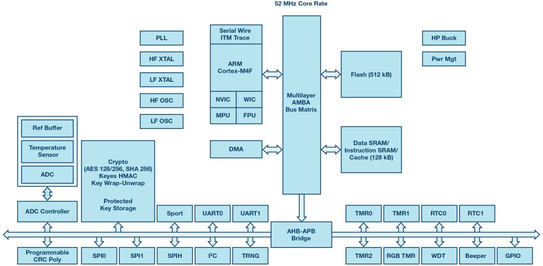 但为什么ADuCM4050比ADuCM3029多消耗10 μA/MHz?这种增加背后的原因是,前者能以两倍于后者的频率工作,因而需要额外的缓冲器来实现对更高频率的时序约束。同ADuCM3029相比,ADuCM4050还有一些额外特性: