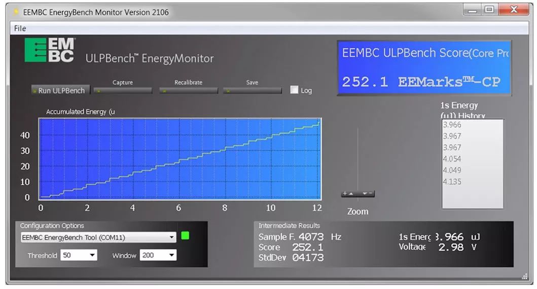 为了测量得分,EEMBC提供了EnergyMonitor软件。单击Run ULPBench(运行ULPBench)按钮后,EnergyMonitor硬件便向ADuCM3029 EZ-Kit板供电,并测量配置文件运行的能耗。执行结束时,软件计算得分并将其显示在屏幕上。软件还会在历史窗口中显示之前周期的平均能耗。