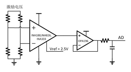 上图所示的是一个典型的电桥测量方案,包含前级差分仪表放大器,电平移位限幅缓冲驱动ADC等结构,提供高精度的小信号采样。典型的仪表放大器可以参考INA188, INA826, INA333,可以覆盖从高电压到低功耗的全部场合,并且CMRR在放大倍数为10的时候的最小值大于100dB。OPA196为TI全新一代的E-trim运算放大器,直流失调电压更是在100uV以下,OPA191甚至达到5uV 。这样高的CMRR和低的失调电压,提高系统精度的同时可以降低系统的设计难度和成本,提升产品的竞争力。