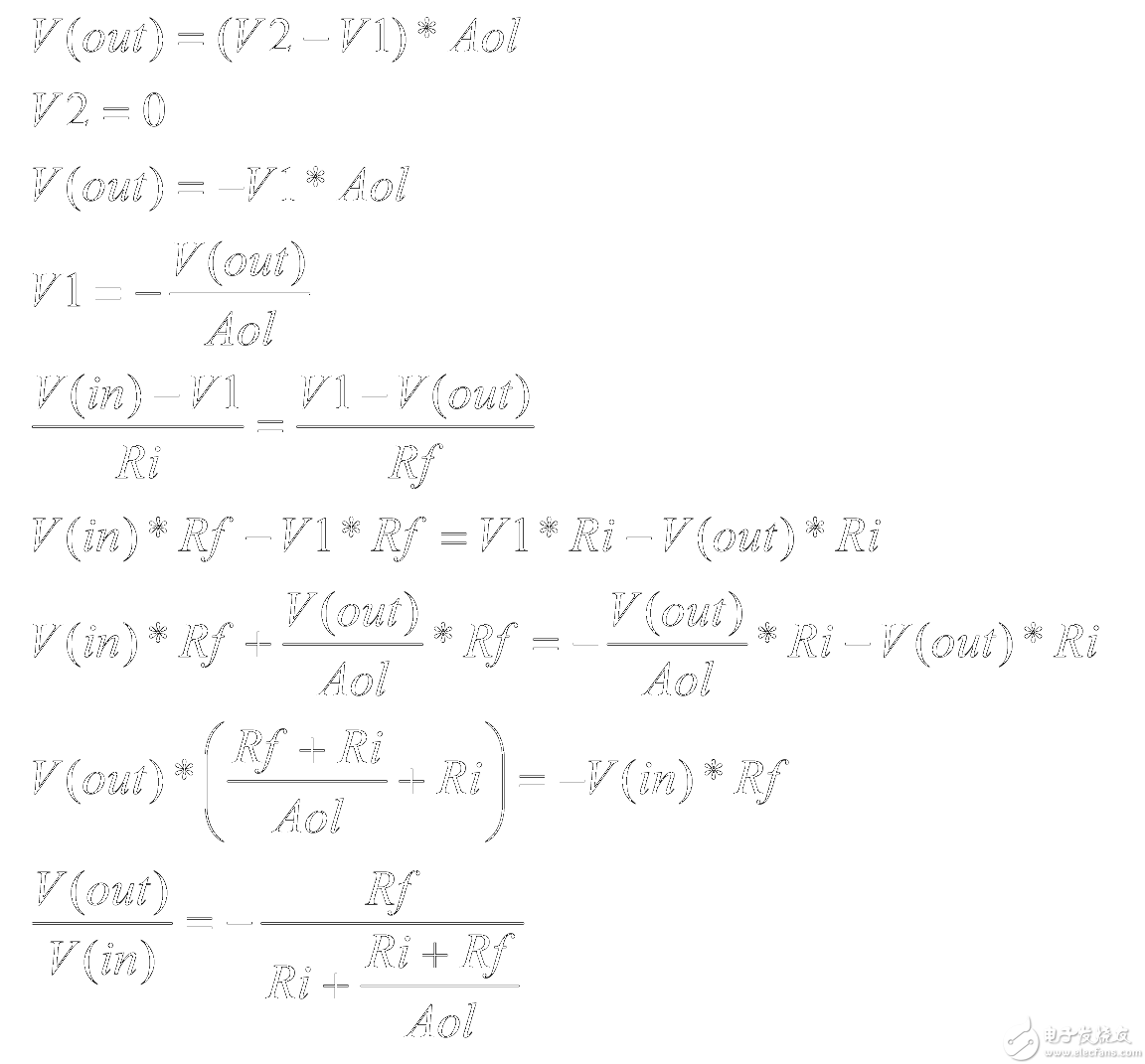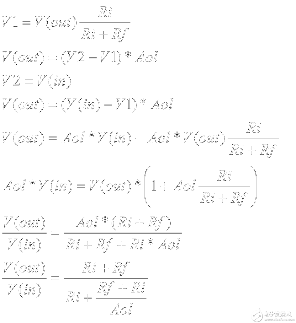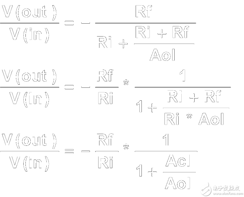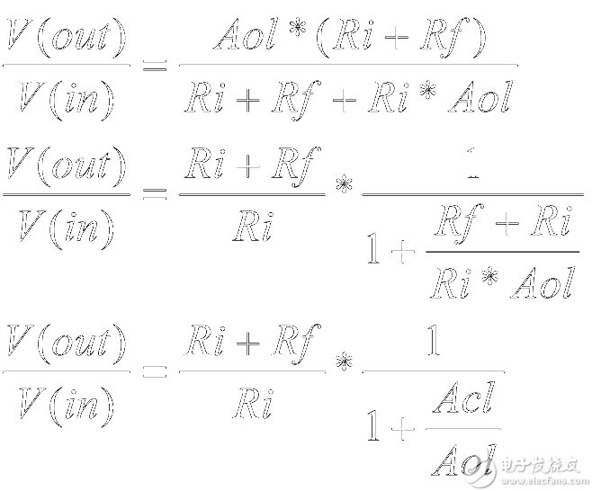 这是理想条件下的闭环增益方程式,其中 Aol 值非常大。当开环增益小于理想条件时,实际的闭环增益方程式将变为: