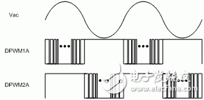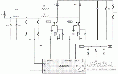在其他一些无桥接 PFC 拓扑结构中[1] [2],图 1是一个已经为业界所广泛采用的无桥接 PFC 实例。它具有两个 DC/DC 升压电路[3] [4],一个由 L1、D1 和S1 组成,而另一个则由 L2、D2 和 S2 组成。D3 和 D4 为慢速恢复二极管。通过参考内部电源接地单独检测线压和中性点电压,测量得到输入 AC 电压。通过对比检测线压信号和中性点信号,固件便知道其为一个正半周期,还是一个负半周期。在一个正半周期期间,第一个 DC/DC 升压电路即 L1-S1-D1 有效,同时升压电流回到二极管 D4 的 AC 中性点。在一个负半周期期间,第二个 DC/DC 升压电路即 L2-S2-D2 有效,同时升压电流回到二极管 D3 的 AC 线。像 UCD3020 这样的数字控制器用于控制这种无桥接 PFC。