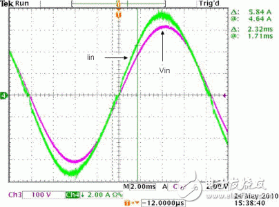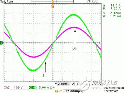 图 5 低线压的 VIN和IIN 波形(VIN = 110V, 负载= 1100W, THD = 2.23%, PF = 0.998)