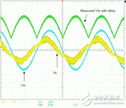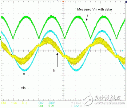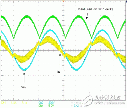 首先,输入 AC 电压通过 ADC 测量。固件读取经测量的电压信号,增加一些延迟,然后使用延迟后的信号来生成电流基准。图 7-8显示了基于 1100W 无桥接 PFC 的测试结果。在这种测试中,Vin = 220V,Vout = 360V,而负载 = 108W(约全部负载的 10%)。通道 1 为 Iin,通道 2 为 Vin,通道 4 为带延迟的测量 VIN 信号。图 7中,经测量的Vin没有增加延迟,PF=0.86,THD=8.8%。图 8 中,测量 Vin 信号被延迟了 300us,PF 改善至 0.90。进一步改善PF是可能的,但付出的代价是 THD,因为进一步延迟电流基准在 AC 电压交叉点产生更多的电流失真。图 9中,测量 Vin 被延迟了 500us,PF 改善为 0.92。但是,电流在电压交叉点出现失真。结果,THD 变得更糟糕,达到 11.3%。