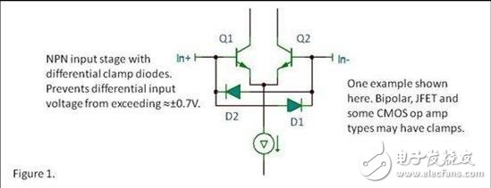 运算放大器用作比较器时,内部差动输入钳位二极管对运算放大器的影响。我提出一个问题——这些钳位会影响运算放大器电路吗?运算放大器在两个输入端之间的电压应大约为零,那么,在标准运算放大器电路中这些二极管绝不会正向偏置……又或者,它们会正向偏置? 稍微提醒一下,我们正在讨论的是一些可能出现某些运算放大器中的差动钳位二极管,请参见图 1。