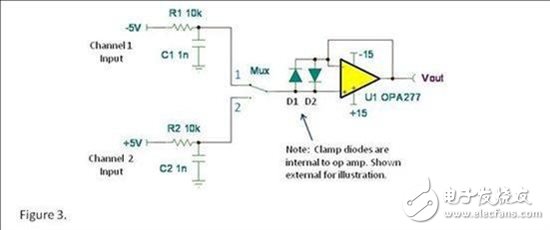 本例中,多路复用器在通道 1 和通道 2 之间切换,因此要求 U1 的输出能够快速地从 -5V 转换至 +5V。D1 正向偏置和由此产生的输入电流瞬态通过多路复用器开关,从而释放 C2 的电压。R/C 输入滤波器通常用于在通道切换期间保持稳定的电压,但是电流脉冲部分对 C2 放电。现在,C2 需要更多时间来重新充电至正确的输入电压,从而降低了复用速率,也即降低了精确度。 解决方法是为 U1 选择使用一种没有差动钳位的运算放大器。如 OPA140 等FET 输入放大器,均拥有低输入偏置电流(以便减少 MUX 串联电阻的负担),并且没有差动输入钳位,极为适合多路复用输入。OPA827 在大多数应用中都表现优异—FET 输入、非常低的噪声、高速且稳定快速。但是,它有一些差动输入钳位,因此 OPA827 或许并非运算放大器多路复用器的最佳选择。之前的博文重点讨论了差动钳位,介绍了使用各种运算放大器类型的一般原则。详情请参阅《运算放大器用作比较器》。 我并不想让读者产生这样的印象:差动输入钳位运算放大器有风险,应该避免使用,但事实并不是这样的。少数情况下,它们会影响您的电路。但如果知道这一点,您就不会做出盲目的选择。您发现差动输入钳位在其他方面影响到您的电路吗?