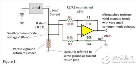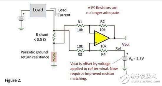 由于杂散或者寄生电阻的压降都很小,因此使用中等共模抑制比的差动放大器便已完全足够。正如我们在上周的文章中所讨论的那样,如果在这种自制差动放大器的电阻器中,有两个电阻器错配 ±1%,则杂散电阻误差电压衰减 100x,也即 40dB 的共模抑制比。 如果这种寄生杂散电阻的唯一电流为已测得的负载电流,则所产生的误差刚好为期望信号的增益误差。它可以为正或者负增益误差,具体取决于电阻器错配的方向。但是,电路板或者系统中常常会存在其他电流,这些电流可能会形成与已测得的负载电流无关的电压。