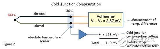 热电耦只测量温差。请注意,在图 1 中您测量了两种示例情况下的相同电压。热结点和冷结点间 100°C 的温差将产生 4.1mV 的电压。获取热端绝对温度测量的老式方法是将冷结点浸入一个冰冷的水中(这是被称作冷结点的另一个原因)。已发布的热电耦参数表假设冷结点为 0°C。