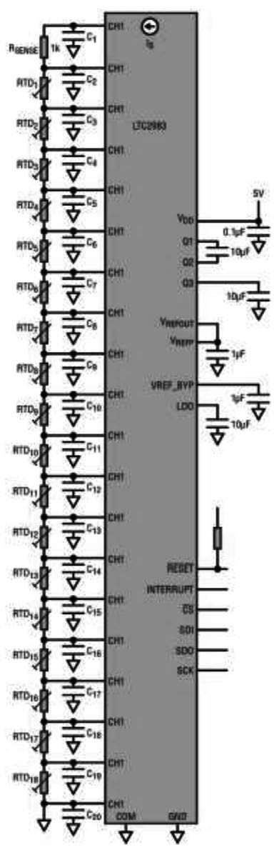 图1 LTC2983 可支持 18 个 RTD 传感器