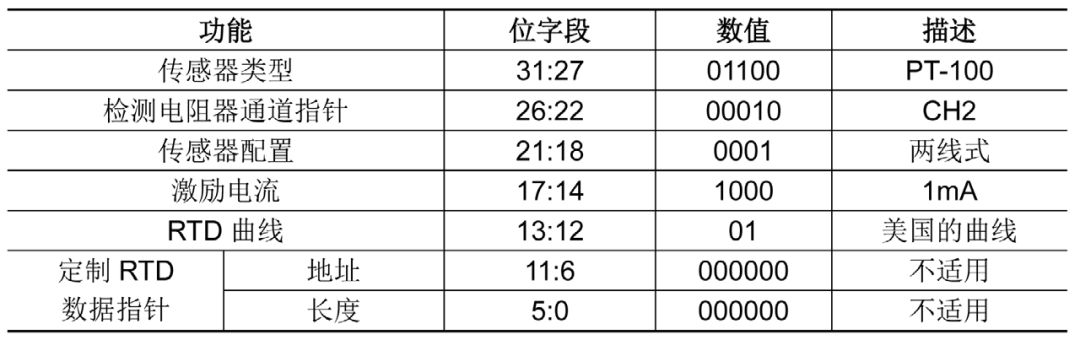 考虑图 1 所示的系统并假设下面限制条件:5V 电源轨、所有的 RTD 探头均为 PT-100 和最大预期温度测量在 150℃。表 1 列出了用于每个 PT-100 探头的通道分配字。其中,在该例中 CH3 检测 RTD1 探头,CH4 检测 RTD2⋯等。连接至 CH2 的电阻器按表 2 所示进行配置。