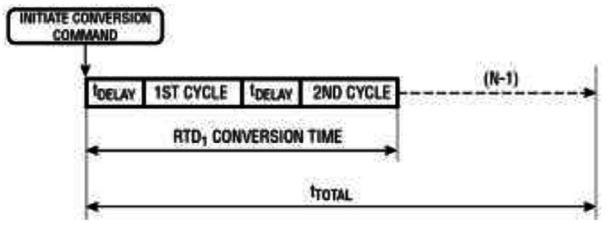 tDELAY 在每个个别ADC周期之前插入。每个 RTD 测量包括两个 ADC 周期。于是,RTD 堆栈的总转换时间大约为: